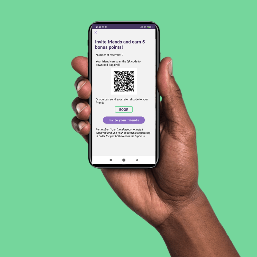 SagaPoll é o aplicativo de pesquisa na África que lhe dá uma voz! Se você for um membro ativo em nossa comunidade, pode ganhar pontos e trocá-los por dinheiro. Além das pesquisas, você sabia que também pode ganhar pontos extras na SagaPoll convidando amigos?