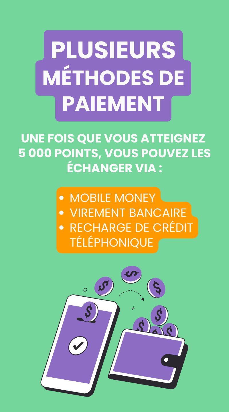 Recevez vos récompenses par virement bancaire, argent mobile ou recharge de temps de communication. Pour connaître les méthodes de paiement pour chaque pays, consultez cette page.