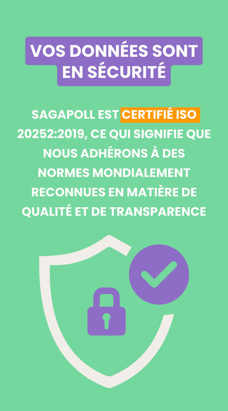 En fait, SagaPoll est certifié ISO 20252:2019, ce qui signifie que nous adhérons à des normes de qualité et de transparence mondialement reconnues. Cette certification garantit que nous fournissons des enquêtes précises et fiables, tout en traitant vos données avec le plus grand soin. Nous sommes l’une des seules entreprises certifiées sur le continent africain, ou peut-être la seule !